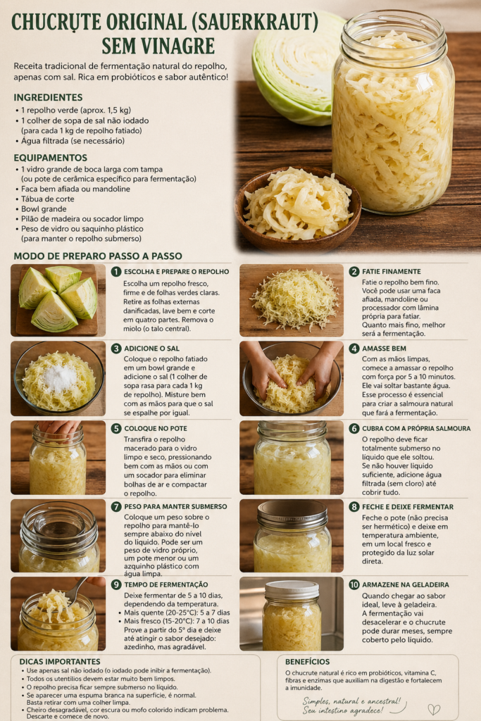 O que torna o chucrute especial é a fermentação natural (sem vinagre!). O sal cria um ambiente ideal para bactérias benéficas, que transformam os açúcares do repolho em ácido lático — responsável pelo sabor azedo e pelos benefícios à saúde.